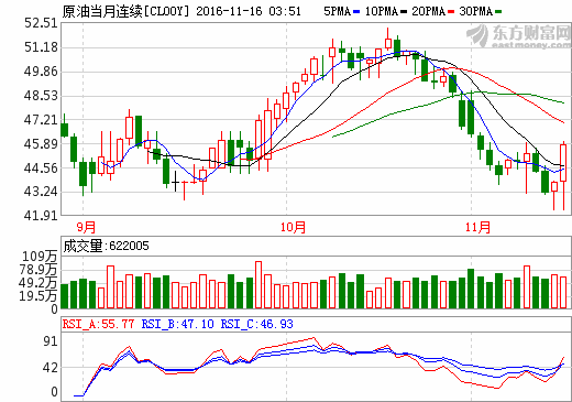 截止收盤,美國(guó)WTI原油12月期貨漲5.75%,報(bào)45.81美元/桶。布倫特原油1月期貨漲5.67%,報(bào)46.95美元/桶。