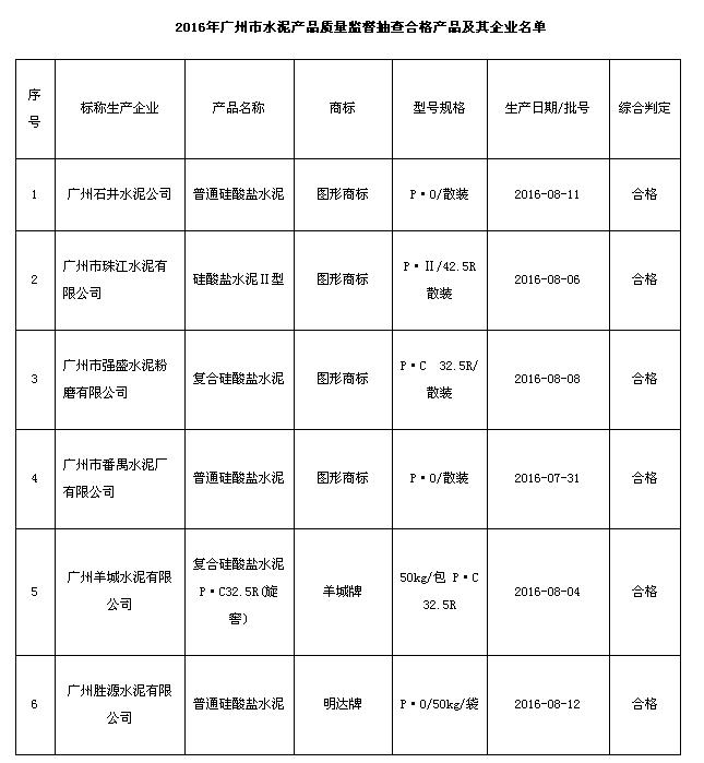 12月2日,廣州市質量技術監督局官網公布2016年廣州市水泥產品質量監督抽查結果,該局近期對本市生產領域水泥產品質量進行了監督抽查,共抽查了6家企業生產的6批次產品,經檢驗全部符合標準要求。