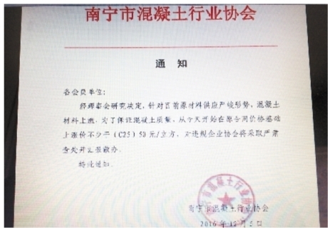 南寧市混凝土行業協會的漲價通知。
