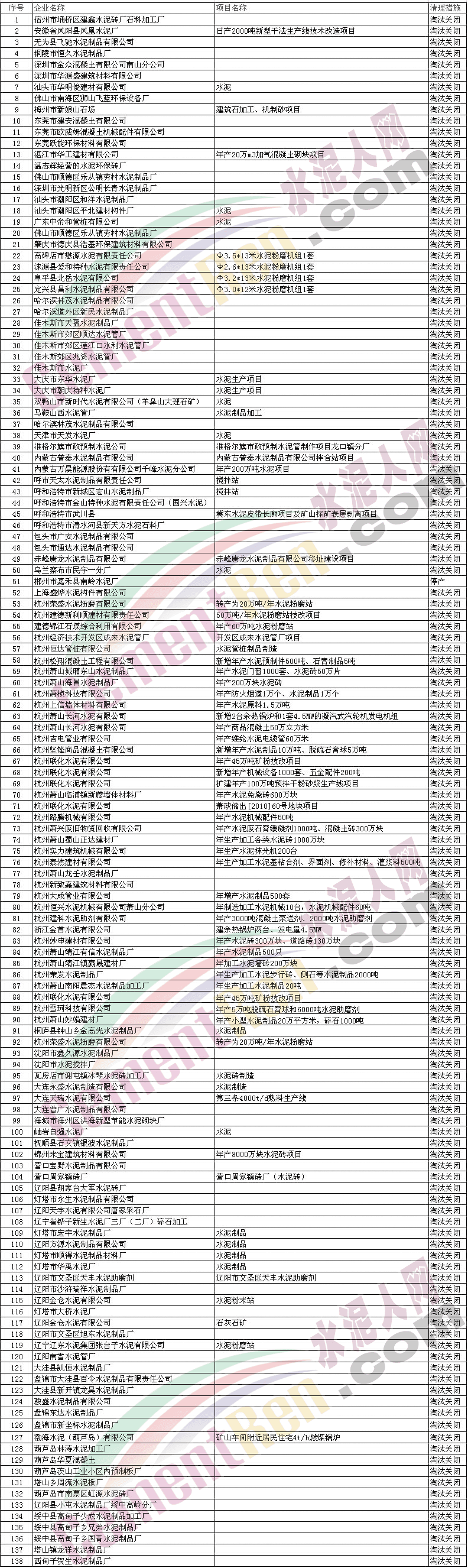 138家被關(guān)停水泥企業(yè)項(xiàng)目名單