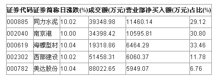 與此同時,在今日登陸深交所龍虎榜個股中,營業部凈買入超1億元公司有2只,其中主板1只,中小板1只。具體來看,同力水泥今天是資金最青睞個股,營業部凈買入金額達1.15億元,高居榜首。此外,南京港營業部凈買入金額也排名居前。(因交易所數據不同步,上交所龍虎榜數據稍后發布。)