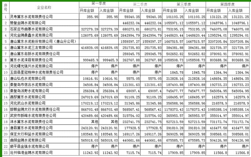河北省國家重點監控企業2016年度排污費公示涉及二十三家水泥企業,除河北曙光強興水泥有限公司、順平縣金強水泥有限公司兩家全年停產及唐山弘也水泥有限公司一二季度停產,淶水冀東水泥有限責任公司一二季度未涉及外,其余19家全年都有征收。 附:河北省國家重點監控企業2016年度排污費公示(23家水泥企業)