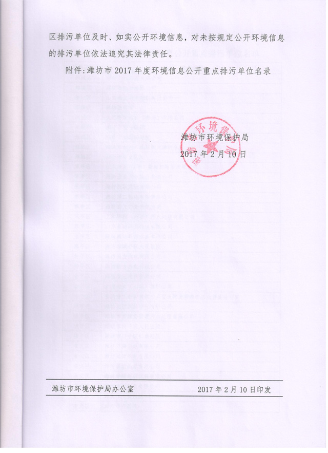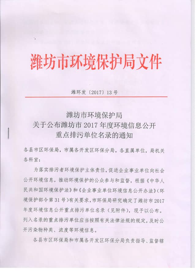 近日,濰坊市環保局對外正式公布《2017 年濰坊市環境信息公開重點排污單位名單》。據悉,該名單的公布是濰坊市環保局為積極落實排污者環境保護主體責任,促進企業事業單位向社會公開環境信息,推動環境保護的公眾參與和監督,依據《中華人民共和國環境保護法》和《企業事業單位環境信息公開辦法》的有關要求面向全社會公布的。濰坊各縣市區共計189家企業事業單位被列入名單。