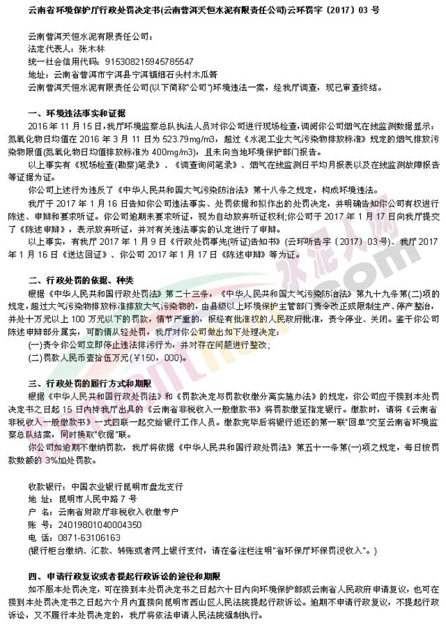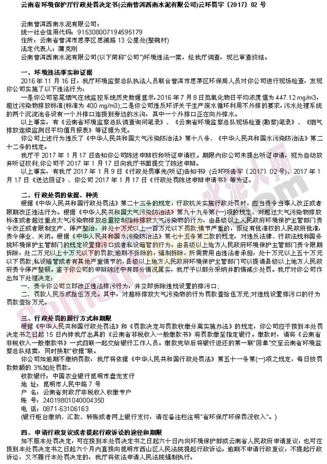 今天(2月15日)一天,云南省就下發4項行政處罰決定,被罰企業涉及3家水泥公司,分別為: 1 云南普洱西南水泥有限公司 2 云南普洱天恒水泥有限責任公司 3 云南尖峰水泥有限公司 附:行政處罰決定原文: