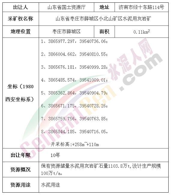 根據《中華人民共和國礦產資源法》、國土資源部《礦業權交易規則(試行)》等有關規定,經山東省國土資源廳批準,委托山東省公共資源交易中心對“山東省棗莊市薛城區小北山礦區水泥用灰巖礦采礦權”予以掛牌出讓。現將有關事項公告如下: