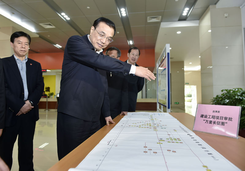 圖片說明:“這些多余的審批項目都該‘打叉’!把它送進歷史。”2015年1月5日,李克強在廣東自貿(mào)區(qū)南沙片區(qū),指著一張長4米、耗時近800天的投資項目審批流程圖說。得知改革后審批時間縮短為原來的1/5,總理說,“萬里審批圖”制約市場活力,容易滋生腐敗。廣東要繼續(xù)先行先試,為“三規(guī)合一”等改革探路。