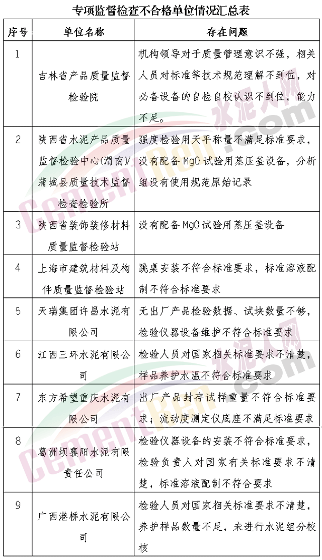 本次監督檢查共對20家水泥產品生產許可獲證企業進行了現場檢查,其中天瑞集團許昌水泥有限公司,江西三環水泥有限公司,東方希望重慶水泥有限公司,葛洲壩襄陽水泥有限責任公司,廣西港橋水泥有限公司等5家企業存在嚴重問題,主要問題包括:無出廠檢驗數據,檢驗儀器設備維護不當,檢驗儀器設備的安裝、稱量等不符合標準要求,檢驗員對國家相關標準要求不清楚,樣品養護水溫不符合標準要求,標準溶液配制不符合要求等,檢查結論為不合格。內蒙古華峰水泥有限公司因停產未接受質監部門現場檢查。