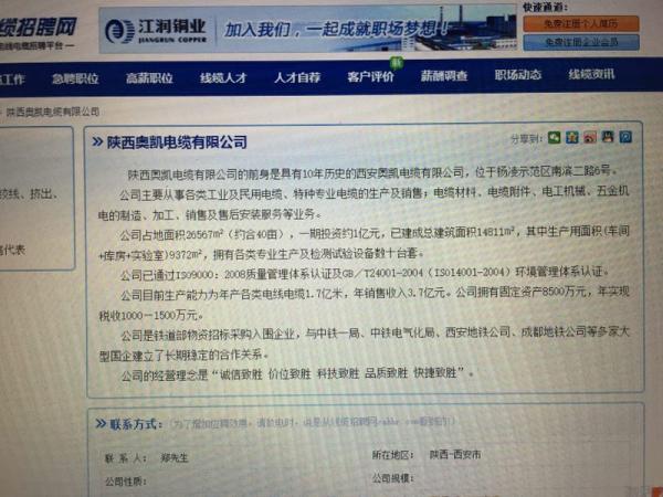 行業網站“線纜招聘網”上的一則招聘信息稱,陜西奧凱公司的前身是西安奧凱公司。
