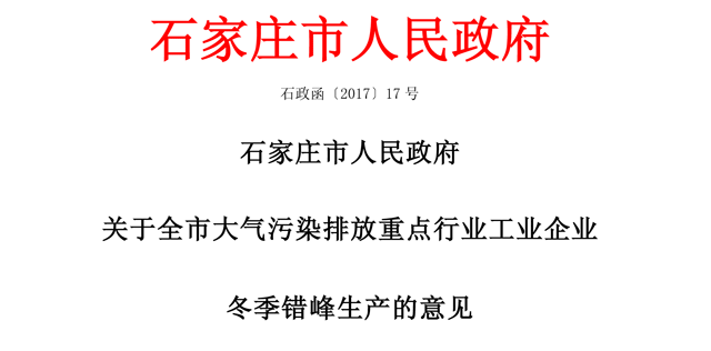 河北省石家莊市政府日前出臺(tái)《關(guān)于全市大氣污染物排放重點(diǎn)行業(yè)工業(yè)企業(yè)冬季錯(cuò)峰生產(chǎn)的意見(jiàn)》(以下簡(jiǎn)稱《意見(jiàn)》)。