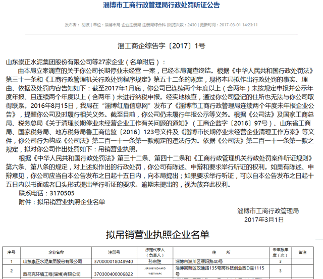 2016年8月15日,淄博市工商局在“淄博紅盾信息網”發布了《淄博市工商行政管理局連續兩個年度未年報企業公告》,提醒上述公司及時履行相關義務。截 至 2017年3月1日,上述公司仍未履行年報公示等義務。根據相關規定,淄博市工商局決定對上述公司予以吊銷營業執照。