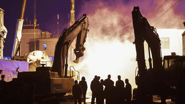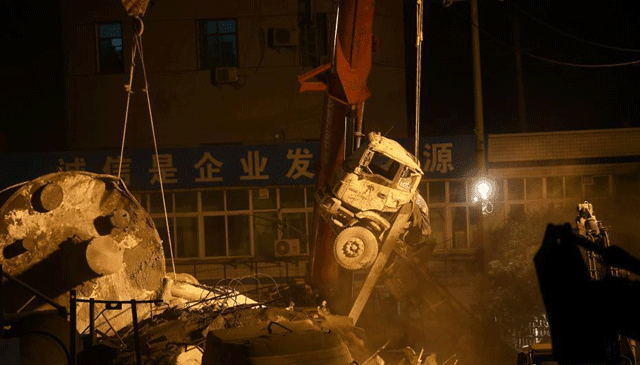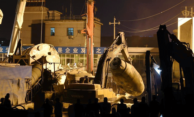 記者了解到,由于倒塌的水泥罐體過重,現場兩臺重型200噸吊車一時無法實施救援。目前,現場施救人員正在對倒塌的水泥罐體進行逐一吊離施救。