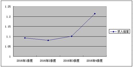 (二)勞動力市場供需平衡,就業結構不斷優化。2016年第四季度,全省各類用人單位共提供空缺崗位44.14萬個,求職總人數為36.37萬,求人倍率為1.21,其余三個季度的求人倍率也均大于1(如下圖)。總的來看,湖南省人力資源市場供求比例保持動態平衡,就業崗位供大于求。隨著湖南省產業結構調整不斷推進,服務業快速發展,省內就業結構進一步優化。從產業用工需求看,第三產業用工需求占用工總需求的58.0%,比重較上年提高1.7個百分點。另外,作為制造業大省,近年來,湖南對接中國制造2025不斷提速,向著制造業強省的目標奮力邁進。2016年,全省制造業用工需求仍居各行業之首,占用工總需求比重的31.0%。
