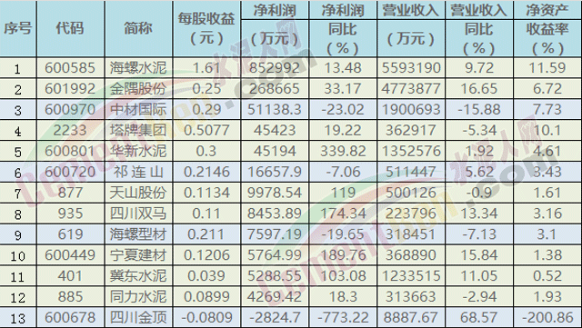 水泥人網小編統計了近期發布年報公告的13家企業的數據,其中凈利潤同比上升的9家,凈利潤同比下降的有4家。2016年年報近利潤第一名的是海螺水泥,其凈利潤達852992萬元,同比增長13.48%。