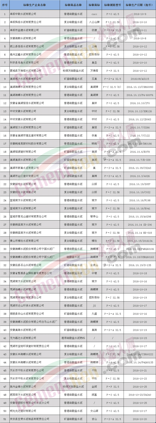 安徽省質監局官網近日公布了2016年水泥產品省級 監督抽查結果,在全省7個地市(合肥、蕪湖、宣城、滁州、阜陽、黃山、亳州)的水泥產品生產領域內共抽取51組水泥樣品,51組水泥產品綜合判定結論均為合格,抽檢合格率為100%。
