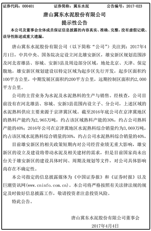 冀東水泥回應:公司在京津冀區域水泥銷售價格上漲,對公司利潤影響暫無法做定量判斷,但有一定正向影響;因目前國家尚未出臺關于雄安新區的建設具體時間、周期及規劃等文件,對公司具體影響尚存在不確定性;公司目前沒有在河北雄縣、容城、安新3縣范圍內設立子、分公司。