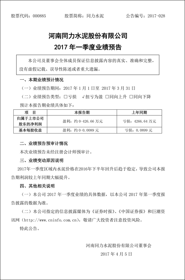 同力水泥(000885)4月5日晚間公告,公司預(yù)計(jì)2017年一季度實(shí)現(xiàn)扭虧,盈利不超過426.66萬元,上年同期為虧損4266.64萬元;扭虧原因?yàn)楫?dāng)季區(qū)域內(nèi)水泥價(jià)格在2016年下半年回升后趨于穩(wěn)定。同力水泥今日漲停,報(bào)收24.09元/股。