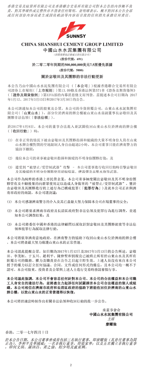 山水水泥(00691.HK)早間公告,公司部分位于濟(jì)南的辦公樓被山東山水前副董事長(zhǎng)宓敬田及其團(tuán)伙非法占領(lǐng)。其中,公司董事被由宓敬田及其團(tuán)伙在山東山水辦公樓限制人身自由超過2小時(shí),最終只能在濟(jì)南警方的協(xié)助下離開。公司將盡全力起訴任何試圖損害公司合法權(quán)益的個(gè)人或組織,委任法律顧問對(duì)上述非法占領(lǐng)和犯罪行為采取法律行動(dòng)。公司相信在濟(jì)南市政府和長(zhǎng)清區(qū)政府的協(xié)助下將能收回位于濟(jì)南的山東山水辦公樓。