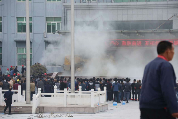 由于辦公樓外有鋼結(jié)構(gòu)大門(mén),來(lái)者未能第一時(shí)間破門(mén)。“大概僵持了兩個(gè)小時(shí)左右,他們搶奪了廠區(qū)內(nèi)一輛推土機(jī)撞擊大門(mén)。”該人士告訴記者,鋼結(jié)構(gòu)大門(mén)瞬間被撞爛,鋼化玻璃散落一地。