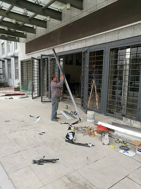 山水集團(tuán)辦公樓被撞倒的玻璃門(mén)