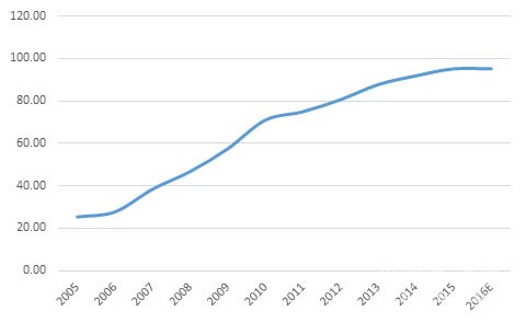 根據國家統計局數據,2015年窯外分解窯熟料產量達12.7億噸,占熟料總產量的95.18%,預計2016年這一比重在95.2%左右,基本與2015年相當。雖然窯外分解窯工藝的熟料產量比重逐年提高,但是截止2016年仍有4.8%的熟料由非窯外分解窯生產。