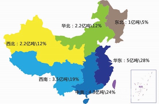 2016年底,全國新型干法熟料設計總產能達18.2億噸(310天計算),北方、南方新型干法熟料產能占全國的比重分別為29.6%(5.4億噸)和70.4%(12.8億噸),其中華東、中南新型干法熟料產能占全國的比重分別為27.6%(5億噸)和23.9%(4.3億噸),西南地區占19%(3.5億噸),西北、華北分別占12%(2.2億噸),東北占5%(1億噸)。