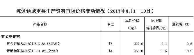 據對24個省(區、市)流通領域9大類50種重要生產資料市場價格的監測顯示,2017年4月上旬,與3月下旬相比,20種產品價格上漲,22種下降,8種持平。其中非金屬建材水泥產品本期價格有漲有降。其中復合硅酸鹽水泥(P.C32.5R袋裝水泥本期價格329.6元,同比價格上漲0.6個百分點;普通硅酸鹽水泥(P.O 42.5散裝水泥,本期價格353.8元,同比下跌0.2個百分點。