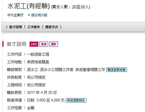 根據《中央社》報導,征人的業者李先生說,關島當地有個大學的新建大樓工程需要工人,因此想從臺灣招募工人過去,將應征有經驗的水泥工20至30人。臺灣的水泥師傅日薪約在2000~3000元,一個月約賺6至7萬。