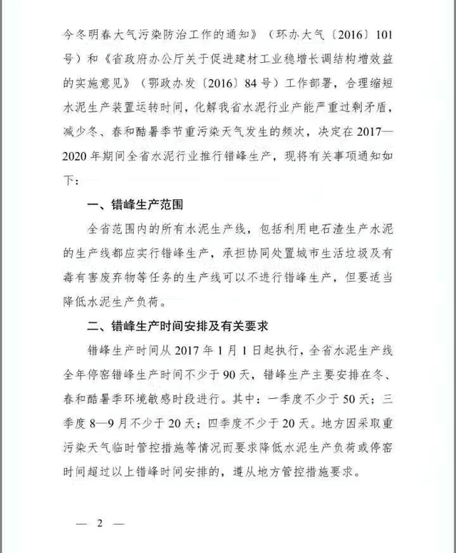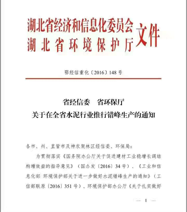 據(jù)水泥人網(wǎng)了解湖北省經(jīng)濟(jì)和信息化委員會(huì) 湖北省環(huán)境保護(hù)廳文件曾在2016年12月15發(fā)布《關(guān)于在全省水泥行業(yè)推行錯(cuò)峰生產(chǎn)的通知》通知要求: