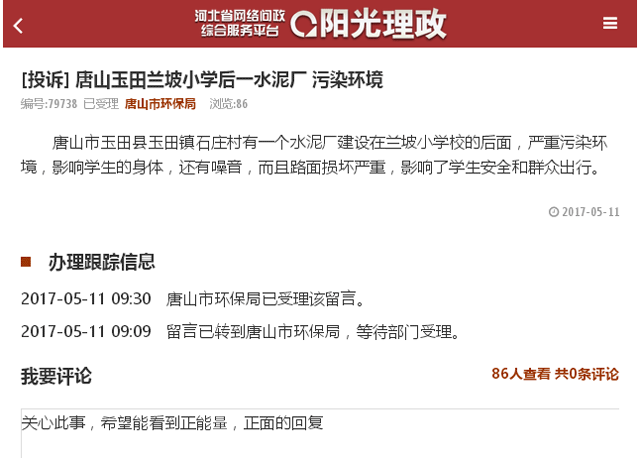 近日,河北省網(wǎng)絡問政綜合服務平臺,陽光理政欄目接到投訴稱唐唐山市玉田縣玉田鎮(zhèn)石莊村有一個水泥廠建設在蘭坡小學校的后面,嚴重污染環(huán)境,影響學生的身體,還有噪音,而且路面損壞嚴重,影響了學生安全和群眾出行。今日09:09該留言已轉(zhuǎn)到唐山市環(huán)保局,09:30唐山市環(huán)保局已受理該留言。