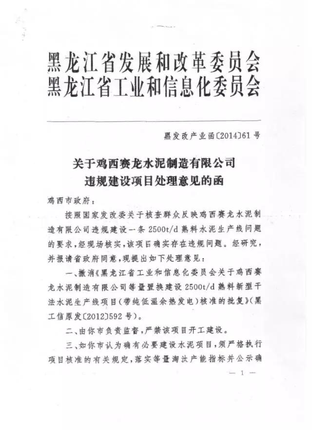 雞西賽龍水泥制造有限公司日產2500噸熟料項目是2014年在國發(2013)41號文下發后開工建設的。因違規,2014年4月24日,黑龍江省發改委、工信委聯合下發黑發改產業(2014)61號文《關于雞西賽龍水泥制造有限公司違建項目處理意見的函》撤銷了其項目核準批復、嚴禁項目開工建設。