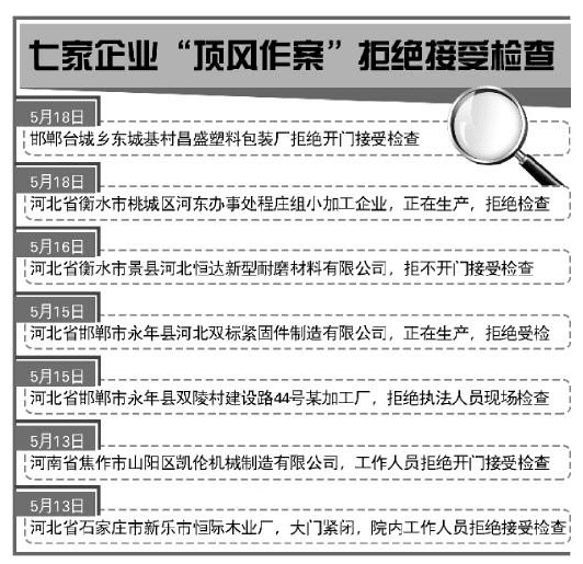 5月15日,第十督查組對河北省邯鄲市永年縣河北雙標緊固件制造有限公司進行檢查時,該公司正在生產,該公司拒絕檢查;當日,督查組在河北省邯鄲市永年縣對雙陵村建設路44號某加工廠檢查時,該廠正在生產,拒絕執法人員現場檢查。