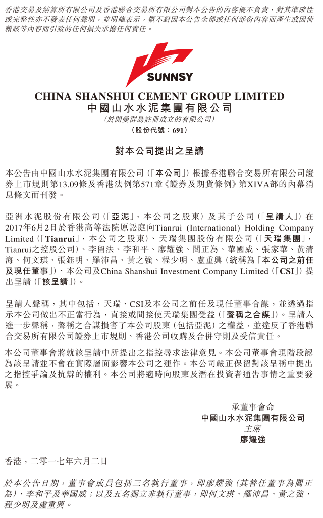 山水水泥(00691)發布公告,該公司股東亞洲水泥股份有限公司及其子公司(呈請人)在2017年6月2日于香港高等法院原訟庭向Tianrui (International) Holding Company Limited(Tianrui,該公司股東)、天瑞集團股份有限公司(Tianrui的控股公司)、李留法、李和平、廖耀強、閻正為、華國威、張家華、黃清海、何文琪、張鈺明、羅沛昌、黃之強、程少明、盧重興(統稱為該公司前任及現任董事)、該公司及China Shanshui Investment Company Limited(CSI)提出呈請。