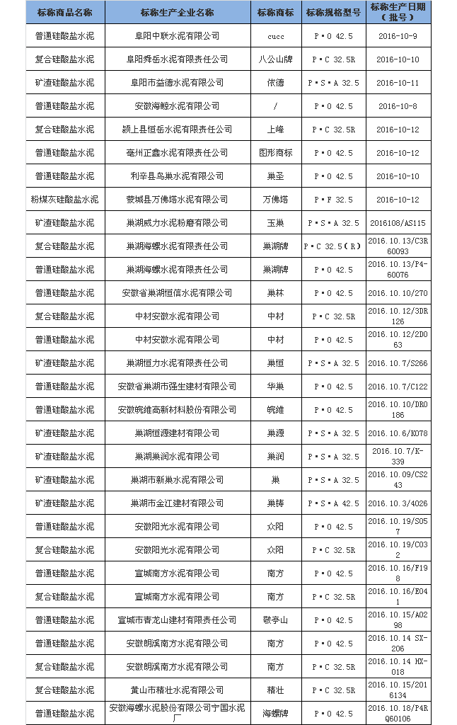 安徽省質監局官網公布的2016年水泥產品省級 監督抽查結果,在全省7個地市(合肥、蕪湖、宣城、滁州、阜陽、黃山、亳州)的水泥產品生產領域內共抽取51組水泥樣品,51組水泥產品綜合判定結論均為合格,抽檢合格率為100%。