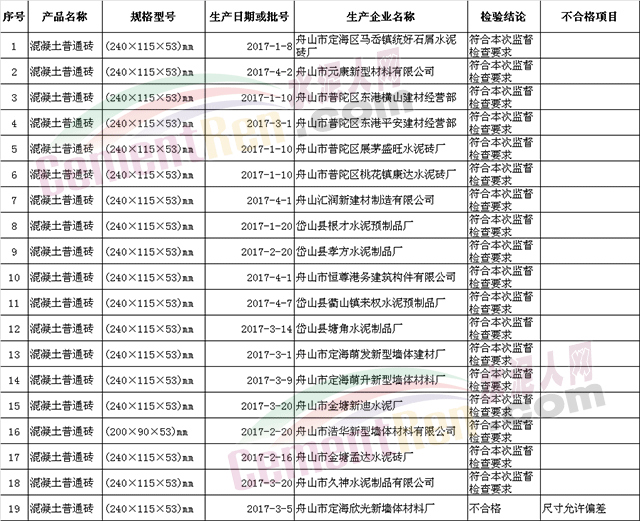 月14日,舟山市市場監督管理局官網公布2017年二季度舟山市混凝土普通磚產品市級監督抽查結果,該局共抽查了19家企業的19批次混凝土普通磚產品,合格18批次,不合格1批次,批次不合格率為5.3%。