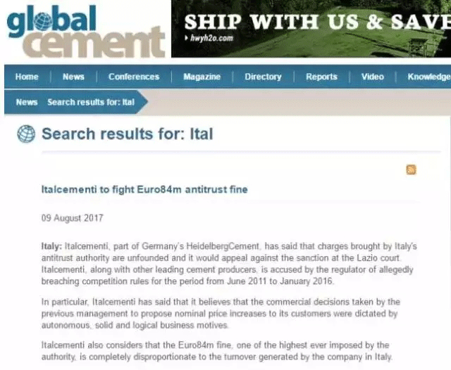 意大利水泥則解釋稱公司此前管理層對他們的客戶提出名義價格上漲的商業決策是符合自由市場規則的,是合乎商業邏輯動機的。意大利水泥同時還認為意大利反壟斷局提出了8000萬歐元的最高反壟斷罰款是和公司的在意大利的營業額完全不成比例的,過于高昂。