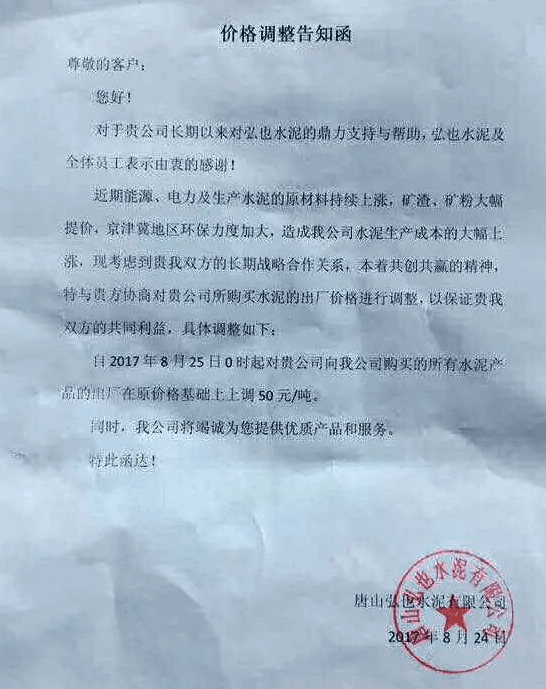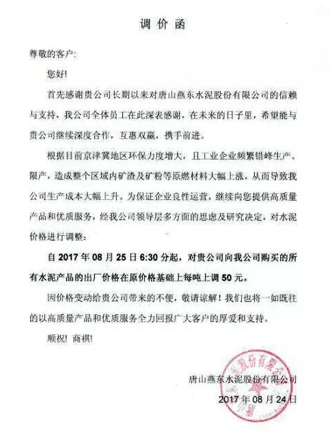月初水泥人網曾發布河北省建筑業協會下發《關于河北省水泥行業去產能實施錯鋒生產的預通知》的消息,通知文件要求河北省內水泥熟料企業于8月8月0時至8月17日24時實施停窯限產10天。隨后部分企業便發布了調價函。調價函內容與本調價內容相似。上調價格幅度在10元~30元不等。8月10日左右滄州地區也跟漲30元/噸。