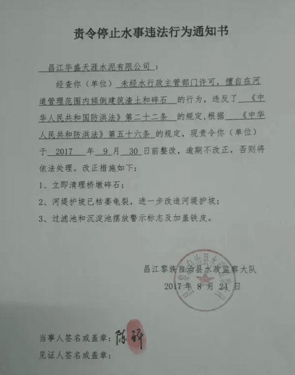 聯合執法部門嚴肅責令華盛水泥廠接受二次《責令停止水事違法行為通知書》,要求華盛水泥廠在2017年9月30日前必須整改以下三點問題:一、立即清理橋墩碎石;二、沉淀池及過濾池須加蓋鐵皮及擺放警示標志;三、河堤護坡已枯萎龜裂,為防止汛期雨水將泥塊沖刷入河,必須限期改造成菱形網格植被護坡。若限期整改效果未達到《責令停止水事違法行為通知書》所要求標準,則依法接受行政處罰。