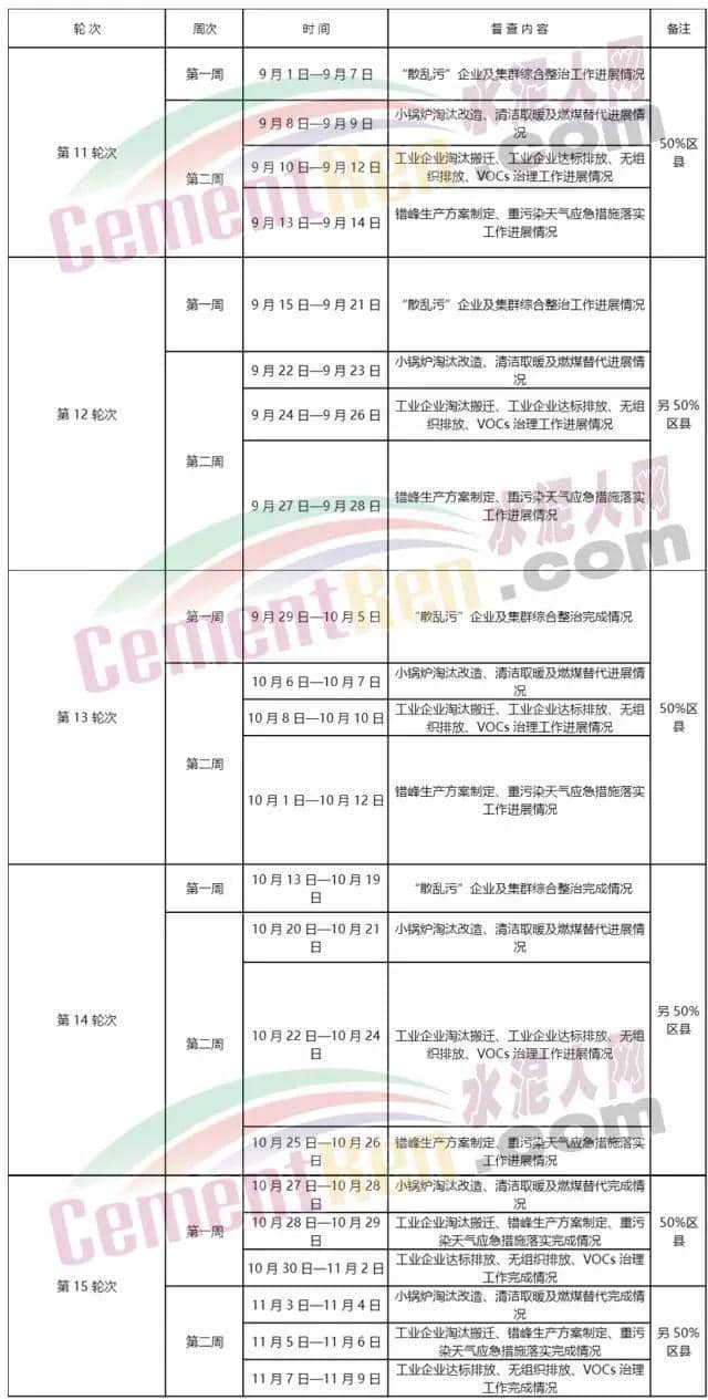 第一階段(2017 年 9 月 1 日至 11 月 9 日),共 5 個輪次(第 11至 15 輪次)70 天,重點對“2+26”城市所有縣(區)全部 12 項任務完成情況、各項減排措施的落實情況、任務清單外的涉氣類突出問題以及《攻堅方案》中“2+26”城市的其他大氣污染綜合治理任務進行督查(具體安排見附 2)。