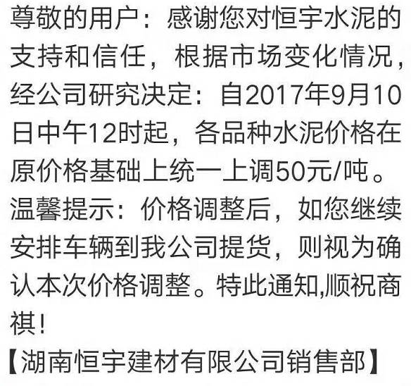 自上周日(10日)起湖南湘潭區(qū)域內(nèi)主導(dǎo)水泥企業(yè)各品種水泥均調(diào)50元/噸。部分企業(yè)發(fā)布通知稱熟料同期上調(diào)50元/噸。通知原文如下: