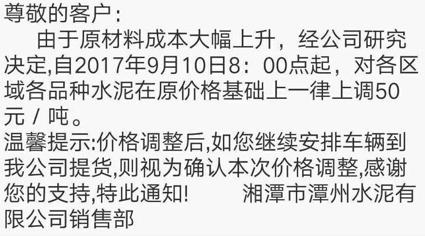根據(jù)當(dāng)前市場形勢(shì)及產(chǎn)銷存情況,我公司決定于2017年9月14日上午8:00對(duì)各品種水泥上調(diào)30元/噸,如您繼續(xù)安排提貨,則視為認(rèn)同此次價(jià)格調(diào)整。