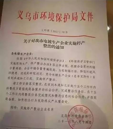 浙江省又開始了新一輪嚴酷的環境保護治理與整頓,于2017年8月14日下發正式文件,“依據《中華人民共和國環境保護法》、《環境保護主管部門實施限制生產、停產整治辦法》等法律法規,為降低環境風險隱患,責令電鍍生產企業實施停產整治,在十五個工作日內將整改任務完成情況和整改信息向社會公開。”