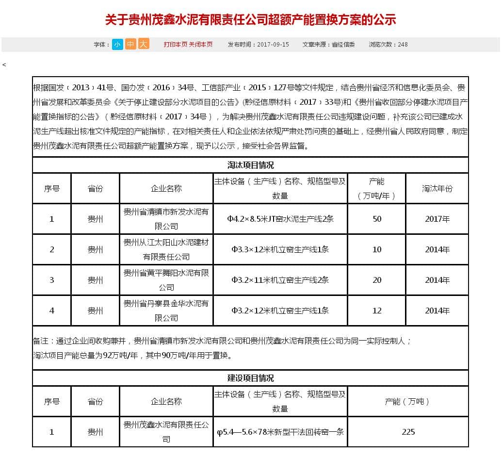 2017年9月15日,貴州省經(jīng)信委在網(wǎng)站發(fā)布了《關(guān)于對(duì)貴州茂鑫水泥有限責(zé)任公司超額產(chǎn)能置換方案的公示》。公示方案中,拿出了貴州省在2013年—2017年之間淘汰的4家立窯企業(yè),共計(jì)92萬(wàn)噸水泥產(chǎn)能,來(lái)置換貴州茂鑫水泥公司違規(guī)超額的熟料產(chǎn)能。并且在公示前言中說(shuō)明:“為解決貴州茂鑫水泥有限責(zé)任公司違規(guī)建設(shè)問(wèn)題,補(bǔ)充該公司已建成水泥生產(chǎn)線超出核準(zhǔn)文件規(guī)定的產(chǎn)能指標(biāo),在對(duì)相關(guān)責(zé)任人和企業(yè)依法依規(guī)嚴(yán)肅處罰問(wèn)責(zé)的基礎(chǔ)上,經(jīng)貴州省人民政府同意,制定貴州茂鑫水泥有限責(zé)任公司超額產(chǎn)能置換方案,現(xiàn)予以公示,接受社會(huì)各界監(jiān)督。”