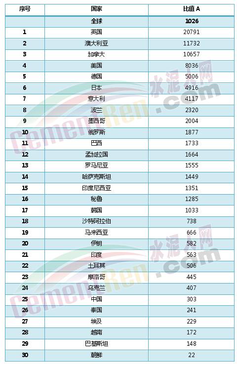 如果我們按比值A(chǔ)的大小來(lái)進(jìn)行排序,我們發(fā)現(xiàn),雖然中國(guó)是水泥產(chǎn)量最大的國(guó)家,且貢獻(xiàn)了世界近60%的比例,但中國(guó)的A比值排在30個(gè)水泥產(chǎn)量最大的國(guó)家中第25名。中國(guó)的A系數(shù)為303,印度為563,美國(guó)為8036,日本為4916。從A比值的巨大懸殊,我們可以得出的不僅僅只有“中國(guó)是水泥生產(chǎn)狂魔”這個(gè)結(jié)論,還有幾個(gè)基本的結(jié)論,即水泥狂魔中國(guó)的第二個(gè)特征是: