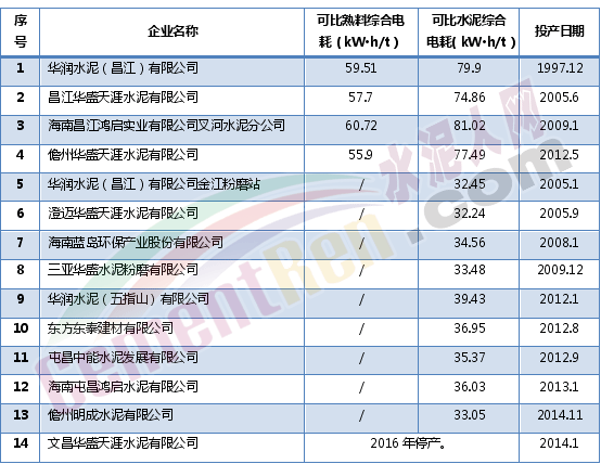 海南省本次公示了14家水泥企業(yè)綜合電電耗,其中文 昌化華盛天涯水泥有限公司于2014年1月投產(chǎn),2016停產(chǎn)??杀仁炝暇C合電耗共四家企業(yè)提供數(shù)據(jù)最低值為55.9千瓦時(shí)/噸,最高值為60.72千瓦時(shí)/噸。13家企業(yè)提供的可比水泥綜合電耗顯示最高值為81.02千瓦時(shí)/噸,最低價(jià)為32.24千瓦時(shí)/噸。