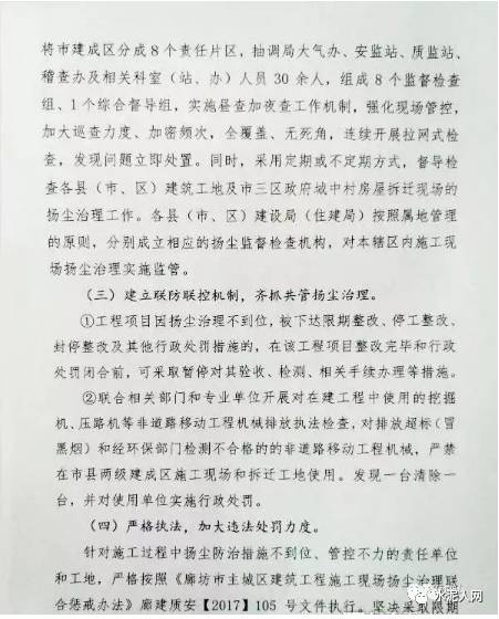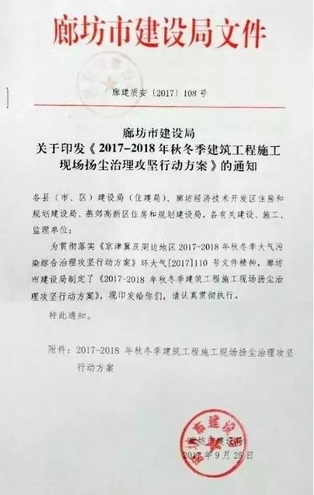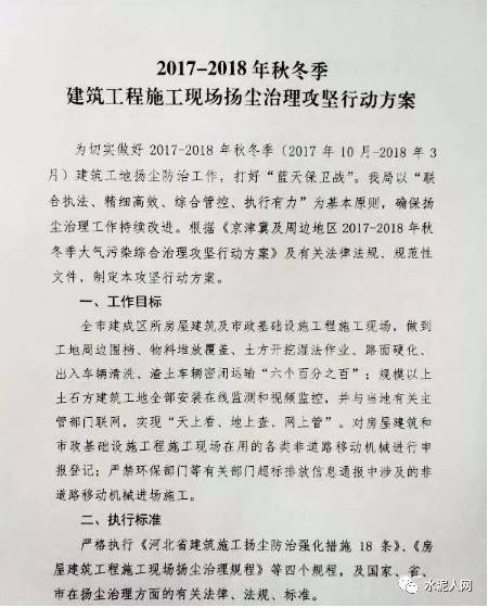 2017-2018年科冬季建筑工程施工現場揚塵治理攻堅行動方案稱:為切實做好2017-2018年秋冬季(2017年10月-2018年3月)建筑工地揚塵防治工作,打好“藍天保衛戰”。我局以“聯合執法、精細高效、綜合管控、執行有力”為基本原則,確保揚塵治理工作持續改進。根據《京津冀及周邊地區2017-2018年秋冬季大氣污染綜合治理攻堅行動方案》及有關法律法規、規范性文件,制定本攻堅行動方案。