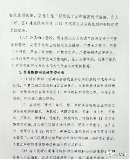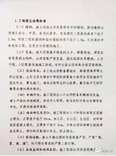 全市建成區所房屋建筑及市政基礎設施工程施工現場,做到工地周邊圍擋、物料堆放覆蓋、土方開挖濕法作業、路面硬化、出入車輛清洗、渣土車輛密閉運輸“六個百分之百”;規模以上土石方建筑工地全部安裝在線監測和視頻監控,并與當地有關主管主部聯網,實現“天上看、地下查、網上管”。對房屋建筑和市政基礎設施工程施工現場在用的各類非道路移動機械進行申報登記;嚴禁環保部門等有關部門超標排放信息通報中涉及的非道路移動機械進場施工。
