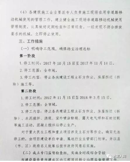 3、停工內容:停止各類建筑工程土石方作業、房屋拆遷(拆除)、水泥攪拌、澆筑、室外噴涂粉刷、露天電氣焊和石材切割等施工活動,混凝土攪拌站停止生產。