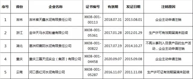 昨日(10日),國家質(zhì)檢總局在其官網(wǎng)公布了已注銷吉林省天鑫水泥有限責(zé)任公司等6056家企業(yè)工業(yè)產(chǎn)品生產(chǎn)許可證,其中含水泥企業(yè)五家。分別為: