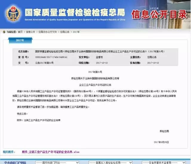 質(zhì)檢總局公告稱: 因不再從事列入目錄產(chǎn)品的生產(chǎn)活動(dòng)、生產(chǎn)許可有效期屆滿未延續(xù)、企業(yè)主動(dòng)申請(qǐng)注銷等原因,質(zhì)檢總局已注銷中國國際鋼鐵制品有限公司等6056家企業(yè)工業(yè)產(chǎn)品生產(chǎn)許可證,并將名單予以公布。