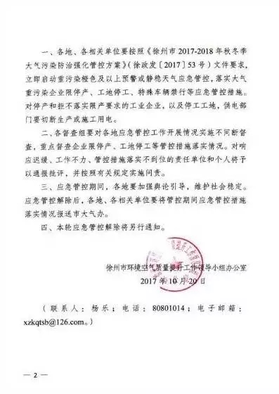 通知稱(chēng),根據(jù)徐州市經(jīng)信委《徐州工業(yè)系統(tǒng)重污染天氣應(yīng)急預(yù)案》(徐經(jīng)信法規(guī)發(fā)【2017】230號(hào))文件要求,啟動(dòng)徐州工業(yè)系統(tǒng)重污染天氣橙色預(yù)警方案。